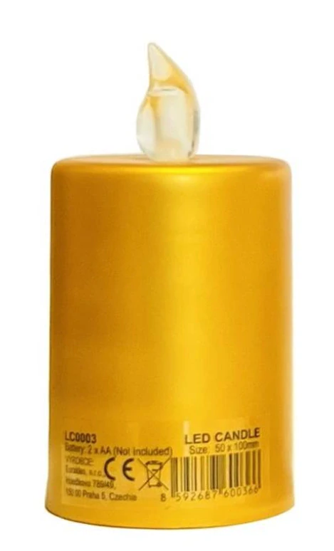 LED svíčka napájena bateriemi. Plápolající, jako pravá svíčka. Bez nečistot z kapajícího vosku. Bez nebezpečí otevřeného ohně.Barva: zlatá. Plamínek: červený. Ovládání: přepínač zap./vyp. Rozměr: 5x10cm. Napájení: 2xAA (nejsou součástí). Stupeň krytí: IP20. Prodej po 12ks v display boxu. Rozměr display boxu: 22x17x11cm. Balení: volně.