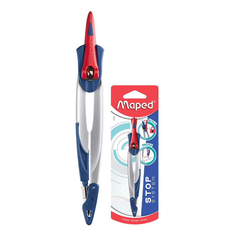 Kovové kružítko s fixací ramen, s 2 mm tuhou. Patentovaný princip systému Stop System-zajištění ramen v dané poloze. Francouzská značka MAPED zaručuje vysokou kvalitu, funkčnost a moderní design.