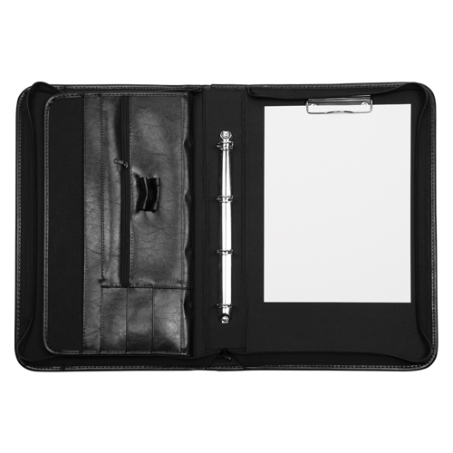 Portfólio se zipem, vybavené 4-kroužkovou mechanikou a klipem, s kapsaminěkolika velikostí. Vyrobené z imitace kůže, rozměry 25 x 43 cm, v černém provední.